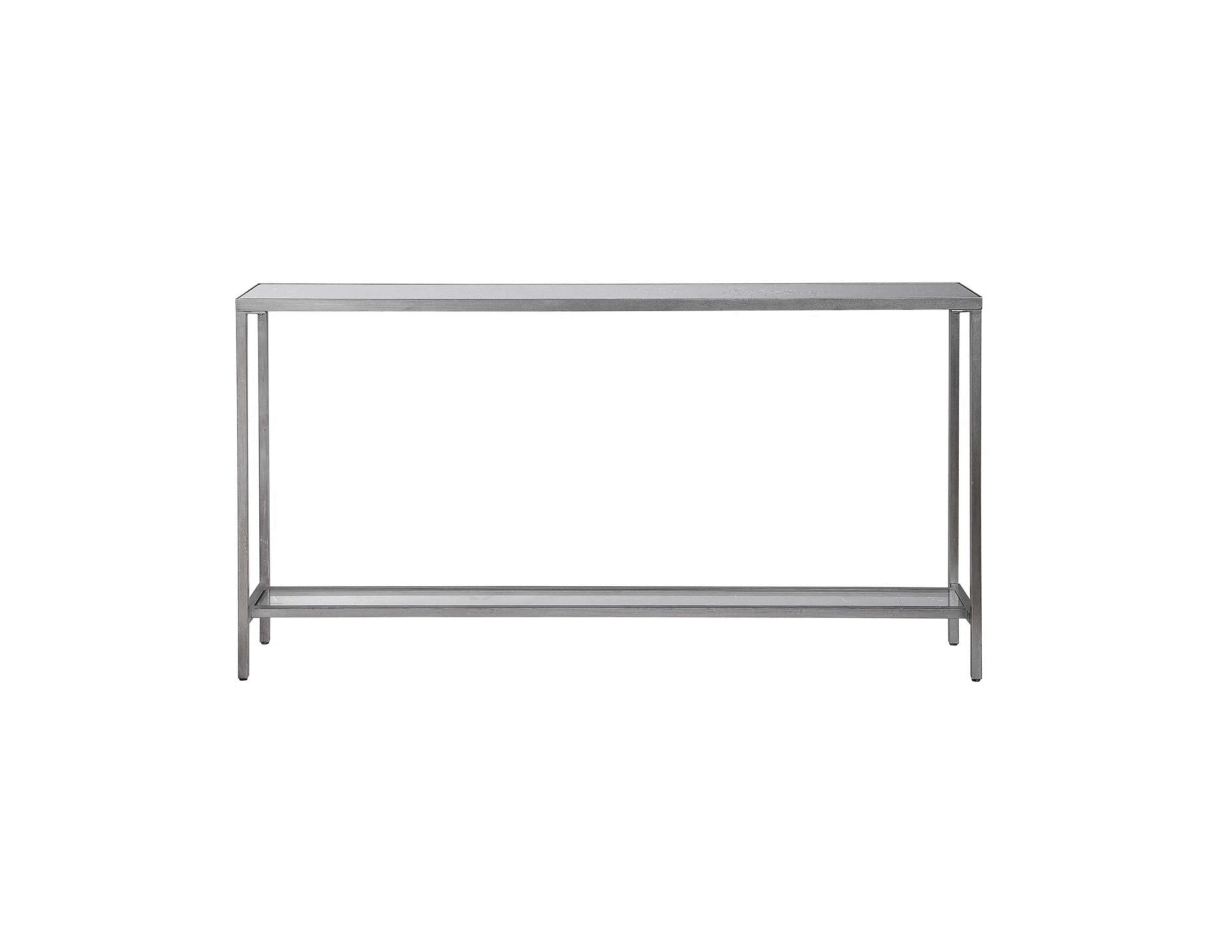 Classic and minimalistic, this narrow iron console table is finished with lightly antiqued silver leaf, inset with a beveled mirrored top, and gallery shelf in clear glass.